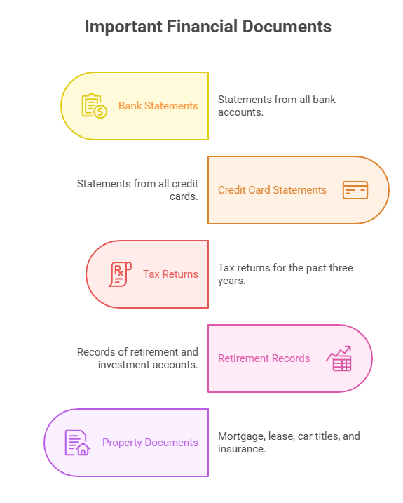 Start by gathering all the paperwork that outlines your family’s financial picture. This includes: