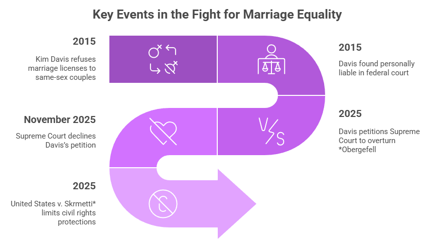 Ten years after Obergefell v. Hodges guaranteed same-sex marriage nationwide, the legal status of that right was formally challenged again in 2025. A key case – Ermold v. Davis – involved a former Kentucky county clerk, Kim Davis, who refused to issue marriage licenses to same-sex couples in 2015. She was found personally liable in federal court, and she asked the Supreme Court not only to review her liability but also to revisit and overturn Obergefell.