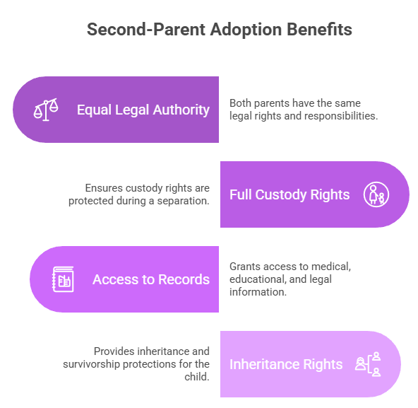 Second-parent adoption allows a non-biological parent to adopt a child without terminating the rights of the biological or first legal parent. In same-sex families, this often applies when one parent gives birth or adopts, and the other wishes to be recognized as an equal legal parent.